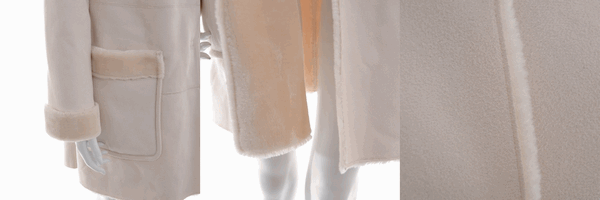 ノーカラーデザインによるエレガントさと、フェイクムートンの優しげな雰囲気を